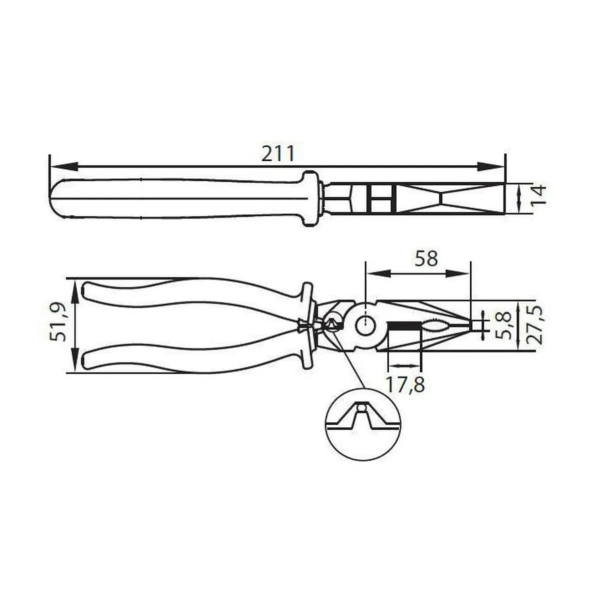 Possui isolação elétrica de até 1.000 V. Arestas de corte com ajuste preciso, temperadas por indução. Aresta de corte longa para facilitar o corte de uma ampla gama de cabos. A ponta, com mordida estriada, ajuda a apertar e dobrar chapas e fios com firmeza. Possuí uma abertura própria para pegar parafusos e dutos, com firmeza reforçada pelas estrias e próximo do fulcro (parte circular em que os dois cabos do alicate se unem), há uma lâmina de corte, capaz de romper arames e fios, finos e médios.