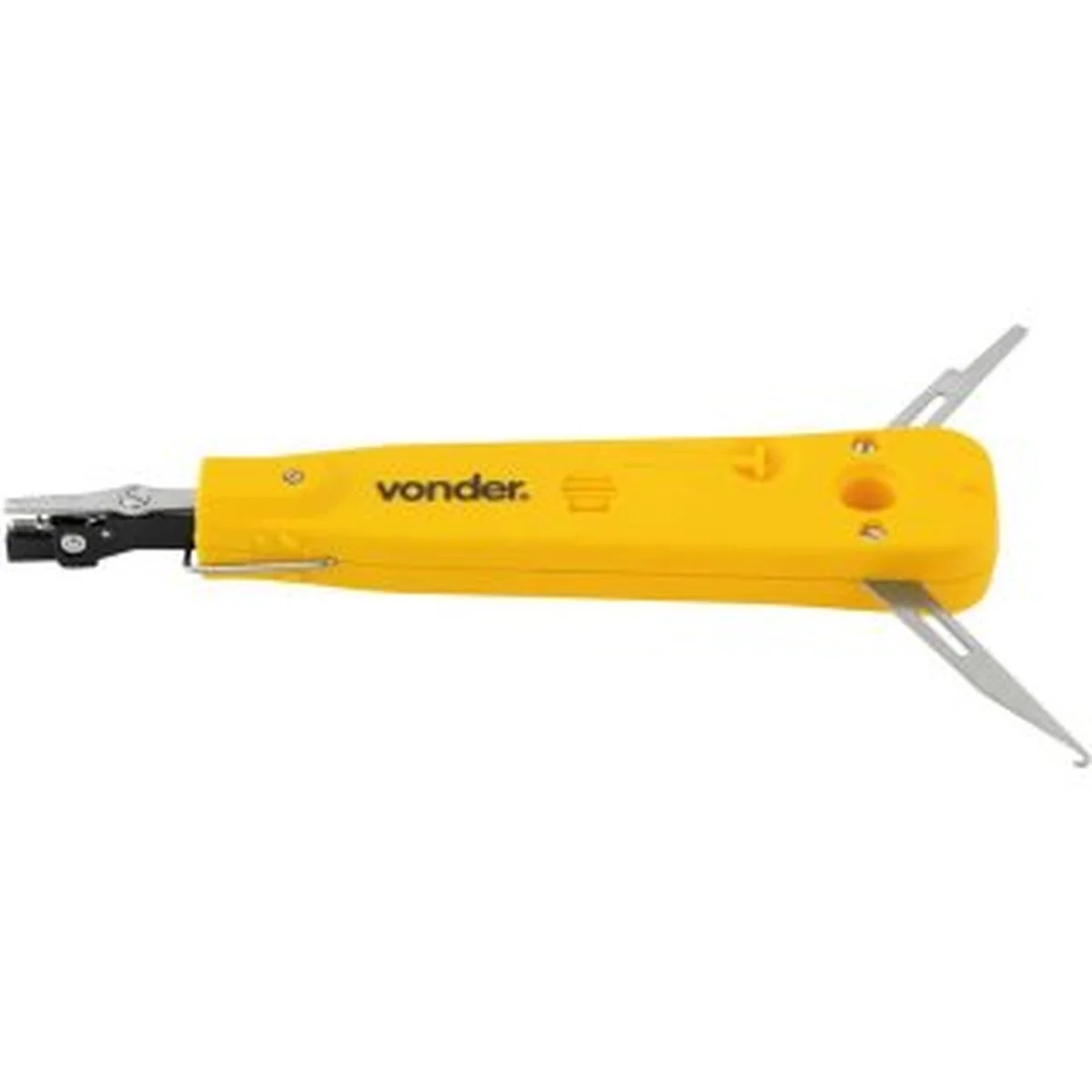 Possui ponta que, além de inserir e conectar o fio no seu terminal, ainda corta automaticamente o excesso. Conta também com uma espátula que serve para encaixar o fio na ranhura destinada e um gancho para retirar os fios dos terminais.