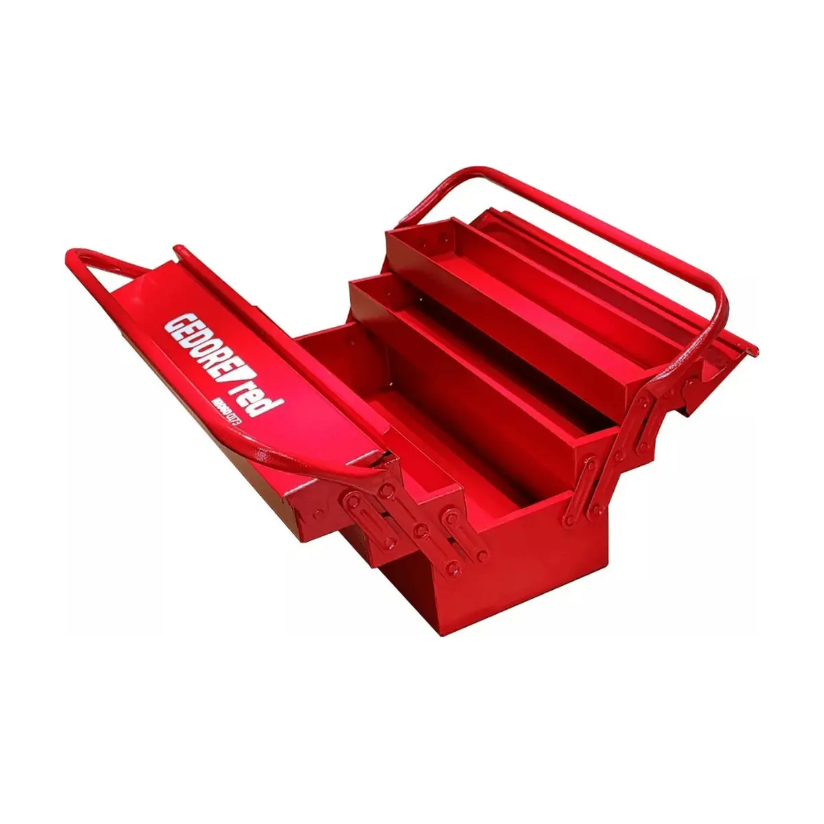 Caixa metálica sanfonada para ferramentas, fabricada em chapas de aço, com pintura em vermelha. Possui furo para utilização de cadeado (não acompanha). Elevada estabilidade. Produto leve e ergonômico. Capacidade de carga de 25 kgf. Este produto não acompanha ferramentas e não acompanha cadeado.