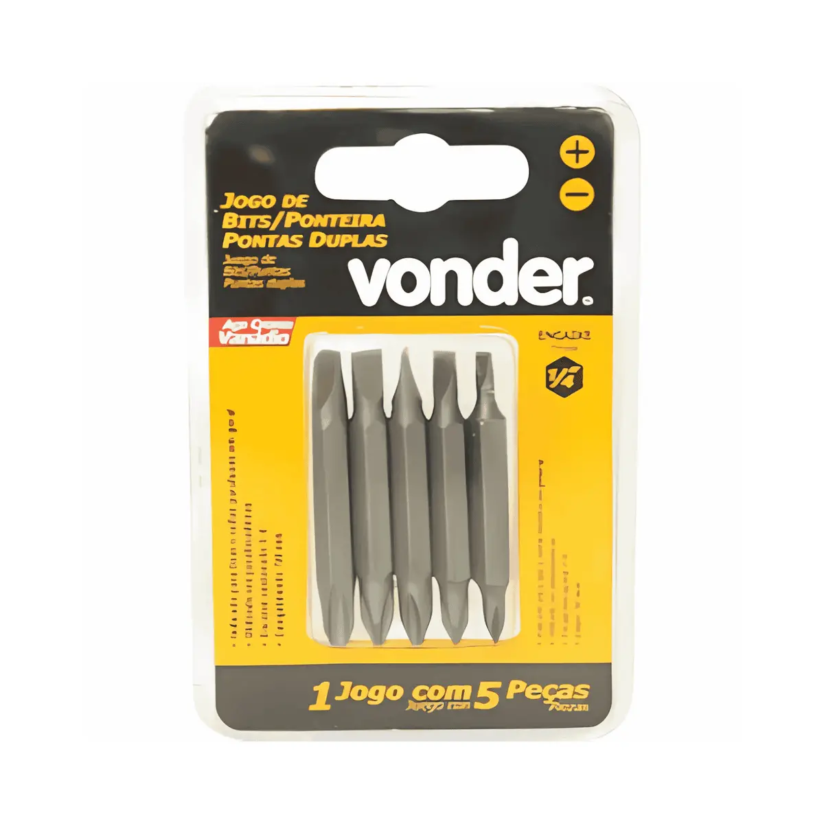 1 Jogo de bits/ponteiras, composto por 5 peças, sendo: 1 peça phillips nº 0 / fenda 3,5 mm - 1 peça phillips nº 1 / fenda 4,5 mm - 2 peças phillips nº 2 / fenda 5,5 mm - 1 peça phillips nº 3 / fenda 6,5 mm.