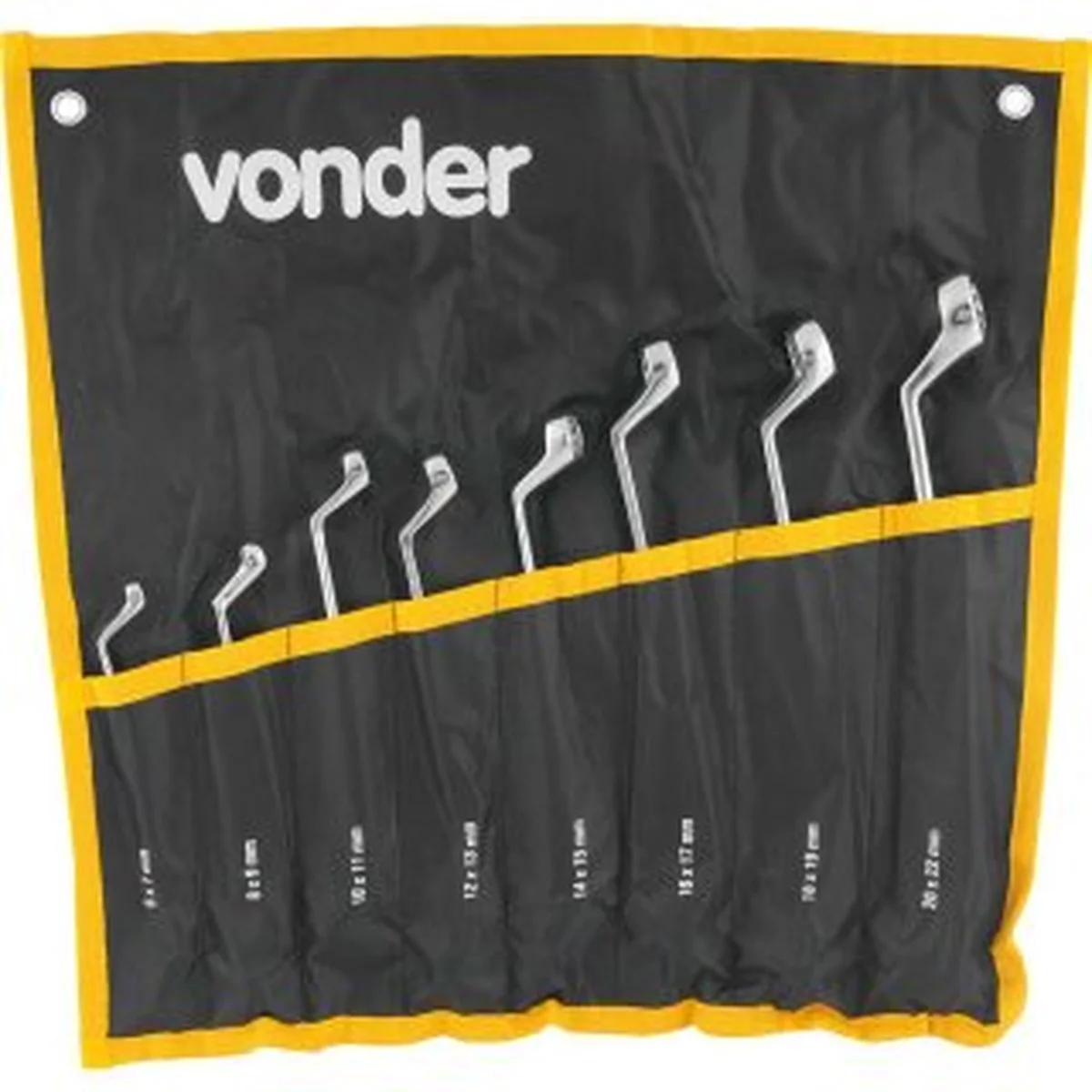 1 Jogo de chaves composto por: 1 chave estrela 6,0 mm x 7,0 mm, 1 chave estrela 8,0 mm x 9,0 mm, 1 chave estrela 10,0 mm x 11,0 mm, 1 chave estrela 12,0 mm x 13,0 mm, 1 chave estrela 14,0 mm x 15,0 mm, 1 chave estrela 16,0 mm x 17,0 mm, 1 chave estrela 18,0 mm x 19,0 mm e 1 chave estrela 20,0 mm x 22,0 mm. Acompanha 1 estojo em lona.