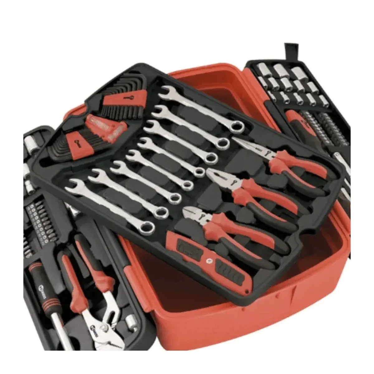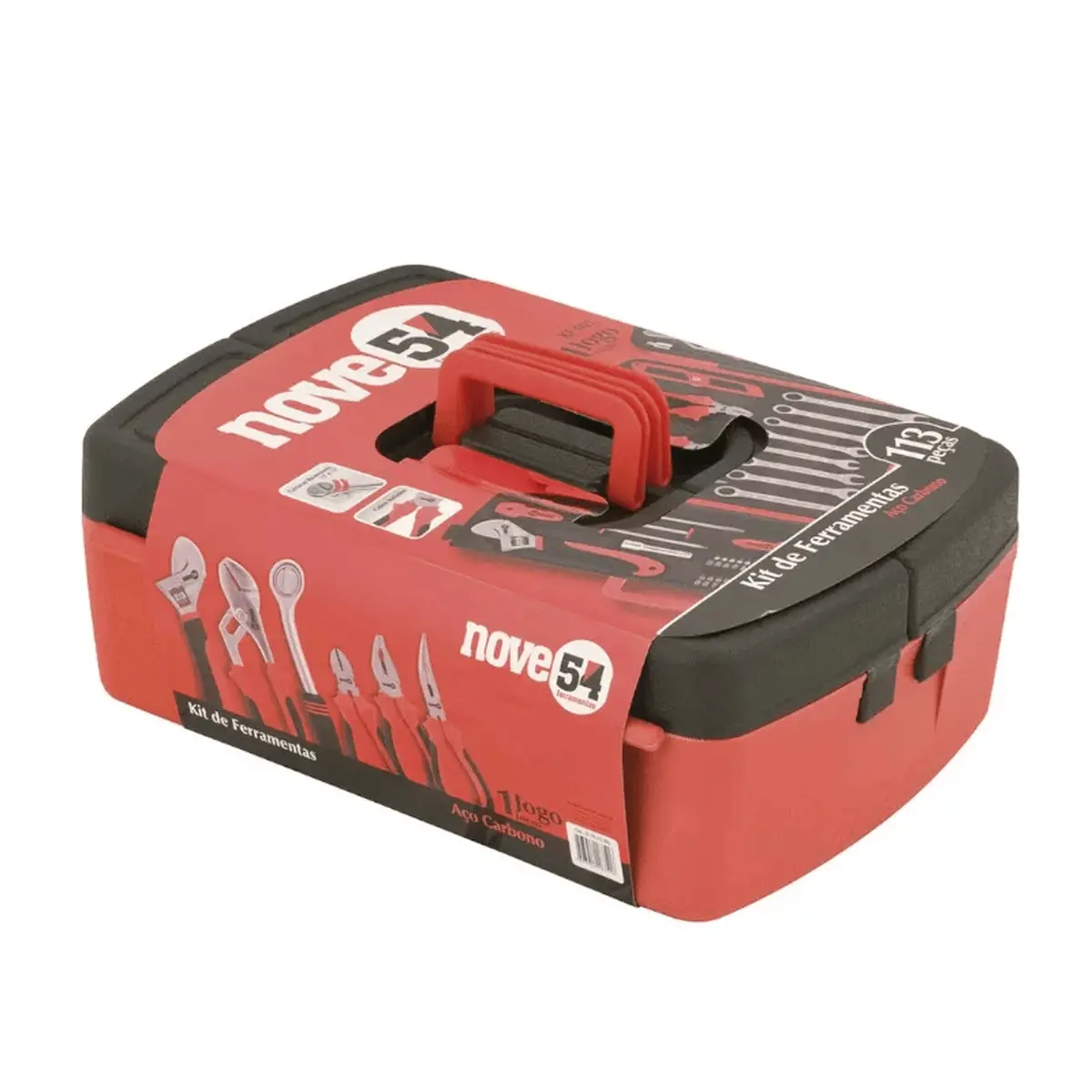 | 1 Jogo de ferramentas, composto por 113 peças, sendo: 1 maleta plástica com bandeja, 3 soquetes sextavados encaixe quadrado 3/8" (14,0 mm, 17,0 mm, 19,0 mm), 3 soquetes sextavados encaixe quadrado 3/8" (5/8", 11/16", 3/4"), 1 soquete sextavado longo encaixe quadrado 3/8" (21,0 mm), 1 extensão encaixe quadrado 3/8" e comprimento 70,0 mm, 1 catraca reversível encaixe 3/8" e comprimento 8", 1 adaptador encaixe quadrado 3/8" para encaixe quadrado 1/4", 10 soquetes sextavados encaixe quadrado 1/4" (4,0 mm, 5,0 mm, 6,0 mm, 7,0 mm, 8,0 mm, 9,0 mm, 10,0 mm, 11,0 mm, 12,0 mm, 13,0 mm), 10 soquetes sextavados encaixe quadrado 1/4" (5/32", 3/16", 1/4", 9/32", 5/16", 11/32", 3/8", 7/16", 15/32", 1/2"), 1 adaptador sextavado/quadrado 1/4", 1 cabo adaptador encaixe sextavado 1/4", 4 bits/ponteiras allen (3,0 mm, 4,0 mm, 5,0 mm, 6,0 mm), 5 bits/ponteiras hexalobular (T10, T15, T20, T25, T30), 10 bits/ponteiras pozidrive (PZ0 (2 peças), PZ1 (2 peças), PZ2 (3 peças), PZ3 (3 peças)), 10 bits/ponteiras phillips (PH0 (2 peças), PH1 (2 peças), PH2 (4 peças), PH3 (2 peças)), 10 bits/ponteiras fenda simples (3,0 mm (2 peças), 4,0 mm (2 peças), 5,0 mm (2 peças), 6,0 mm (2 peças), 7,0 mm (2 peças)), 12 chaves allen (0,90 mm (2 peças), 1,72 mm (2 peças), 1,5 mm, 2,0 mm, 2,5 mm, 3,0 mm, 3,5 mm, 4,0 mm, 5,0 mm, 6,0 mm), 12 chaves allen (0,036" (2 peças), 0,05" (2 peças), 1/16", 5/64", 3/32", 7/64", 1/8", 9/64", 5/32", 3/16"), 8 chaves combinadas (10,0 mm, 12,0 mm, 13,0 mm, 14,0 mm, 3/8", 7/16", 1/2", 9/16"), 1 alicate universal 6", 1 alicate de corte diagonal 6", 1 bico meia-cana 6", 1 chave de fenda 1/4" x 4", 1 chave phillips (PH2 - 1/4" x 4"), 1 chave ajustável 7.1/2" - abertura 27,0 mm, 1 alicate bomba d'água - abertura 24,0 mm, 1 nível mini (vertical e horizontal) e 1 estilete trapezoidal 8" (corpo metálico). |