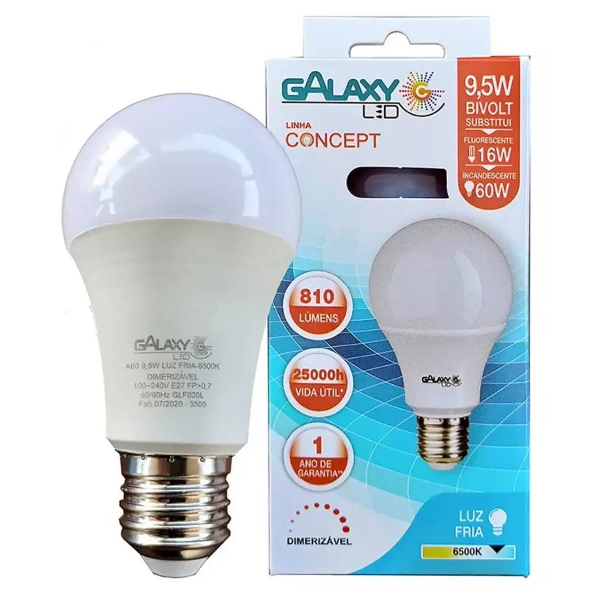 Lâmpada de Led Bulbo Dimerizável A60 9,5W Branca Fria 6500K Bivolt GalaxyLED é própria para a substituição de lâmpadas incandescentes de 60W ou fluorescentes compactas de 16W.