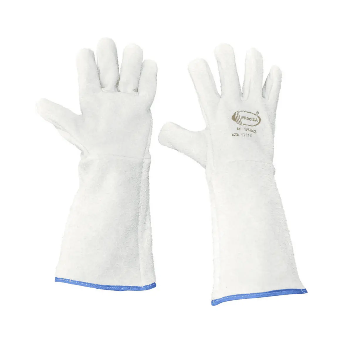 Luva de segurança confeccionada em raspa de couro, costura com fios de poliéster.