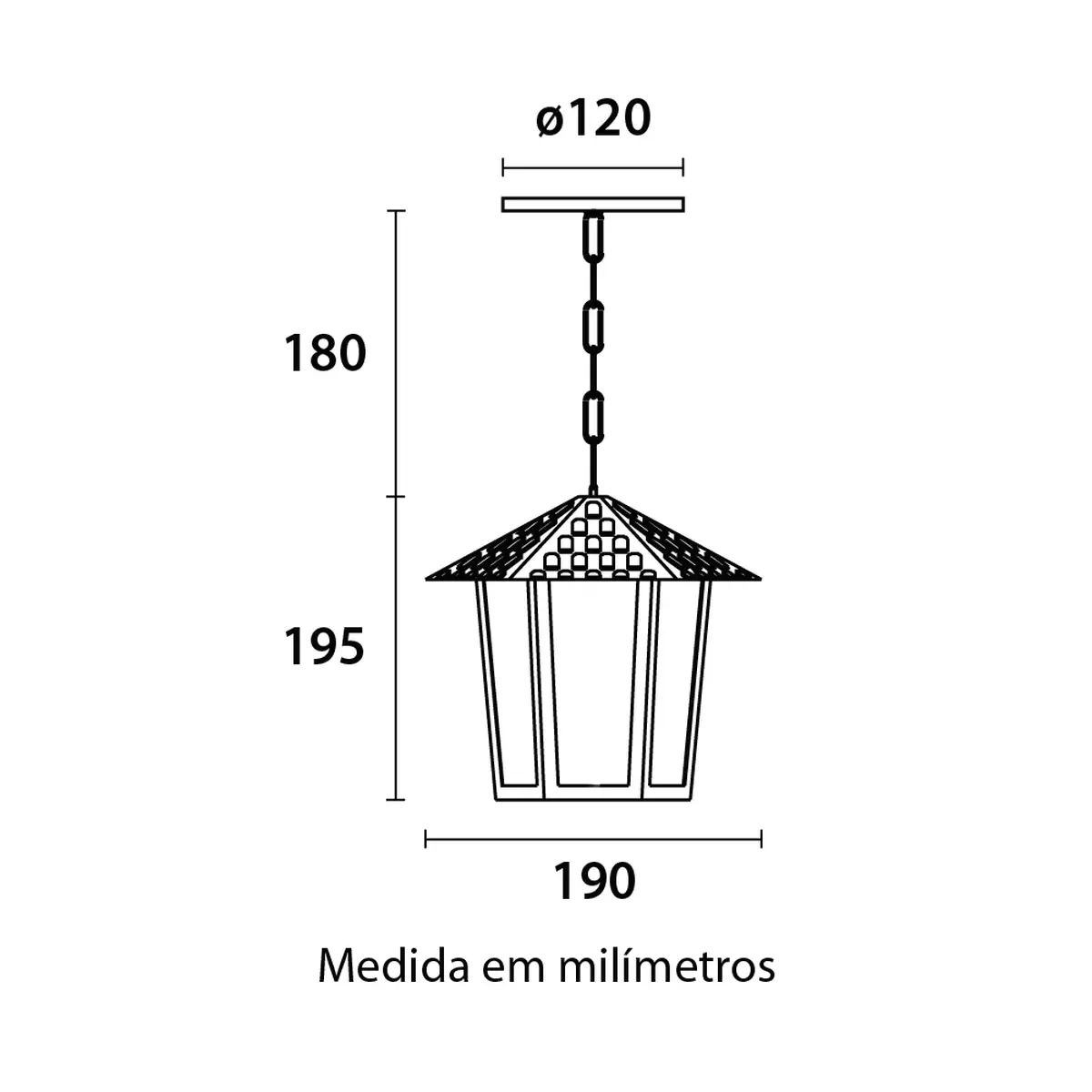 Feito no Brasil desde 1978. Conta com corpo em aço, pintura a pó, lente de vidro pontilhado, soquete E27 que atende as variações de tensão entre 127V e 220V. Seu design clássico pode ser notado nos detalhes do telhado e estima acabamento que lembra telhas. Possui 1 ano de garantia.